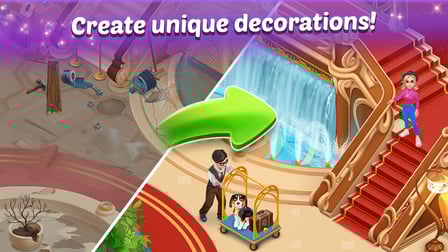 Mulailah dengan terjun ke dalam teka-teki match-3 untuk mendapatkan sumber daya yang diperlukan untuk renovasi hotel. Padu padankan tiga atau lebih item identik untuk menghapusnya dari papan dan mencapai tujuan level. Berinteraksilah dengan karakter dan buat keputusan yang akan mempengaruhi alur cerita. Gunakan sumber daya yang Anda kumpulkan untuk menghias dan mendekorasi hotel, menciptakan destinasi impian bagi tamu Anda.