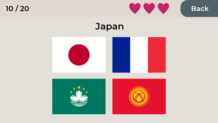 Mulailah dengan memilih salah satu dari tiga mode: Mudah, Sedang, atau Keras. Setiap mode menyajikan serangkaian bendera untuk Anda identifikasi bersama dengan negara dan ibu kotanya masing-masing. Klik jawaban yang benar dari pilihan pilihan ganda yang disediakan. Semakin cepat Anda menjawab, semakin tinggi skor Anda. Awasi pengatur waktu dan coba jawab sebanyak mungkin pertanyaan dengan benar untuk mendapatkan bintang.
