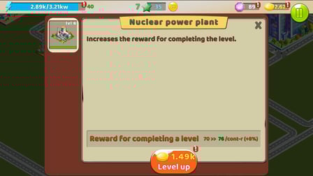Anda dapat meningkatkan sumber energi Anda melalui menu dalam game, di mana Anda akan melihat opsi untuk peningkatan seperti pembangkit listrik tenaga panas atau nuklir.