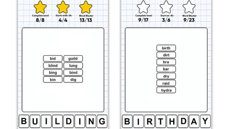 Dalam Make Words from Words, Anda akan mengendalikan kecakapan linguistik Anda untuk membentuk kata sebanyak mungkin dari sekumpulan huruf. Anda akan menemukan banyak level, masing-masing dengan rangkaian huruf yang unik dan kombinasi kata yang potensial. Tujuannya adalah untuk mengekstrak jumlah kata maksimum dari kata awal yang diberikan, mendapatkan bintang saat Anda maju. Gim ini menampilkan berbagai lokasi dan sistem penilaian inovatif yang membuat Anda tetap termotivasi untuk meningkatkan keterampilan membentuk kata Anda. Cocok untuk segala usia, Make Words from Words mengajak semua orang mulai dari anak-anak hingga orang dewasa untuk terlibat dalam latihan melatih otak yang menyenangkan sekaligus mendidik. Gim ini tidak memberlakukan batasan usia apa pun, membuatnya dapat diakses oleh khalayak luas yang ingin menantang kosakata dan logika mereka.