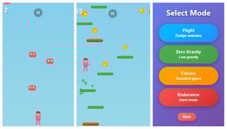 Moonler Jump memiliki empat mode menarik: Penerbangan, Gravitasi 0, Klasik, dan Ketahanan, yang cocok untuk pemain dari semua tingkat keterampilan.