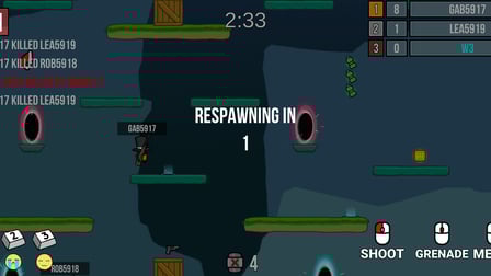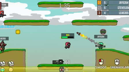 A: Ada tiga karakter yang bisa dipilih di Shooter 2D Online.Q: Jenis senjata apa yang tersedia?