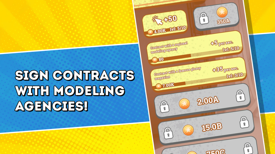 Preparati a intraprendere il tuo viaggio di modellazione anime facendo clic sulla tua strada verso il successo. Il tuo obiettivo principale è guadagnare monete, firmare contratti con i modelli e far crescere la tua agenzia. Usa saggiamente le tue risorse per salire di livello le tue eroine e sbloccare nuove funzionalità che ti aiuteranno a dominare l'industria della modellazione!