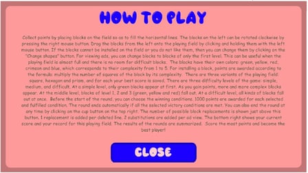 Utilizzare il mouse o touch screen per manovrare e rilasciare blocchi nel campo di gioco. Fare clic e trascinare per posizionare i blocchi in modo efficace, pur essendo consapevoli della loro complessità e potenziale contributo punteggio. Ogni installazione di un blocco viene calcolata in base alle sue dimensioni moltiplicate per la sua complessità, aggiungendo livelli di profondità strategica al tuo gameplay.