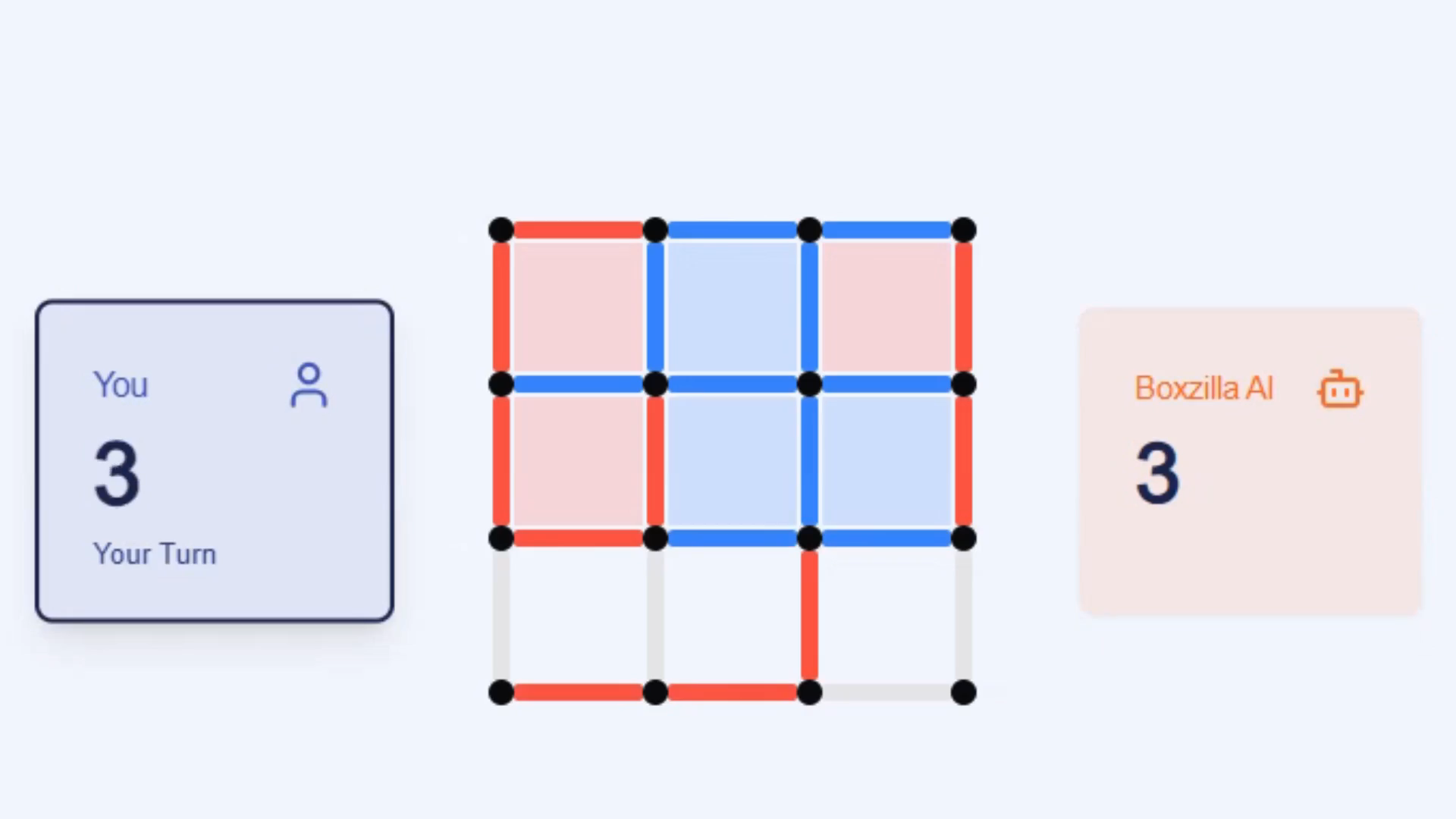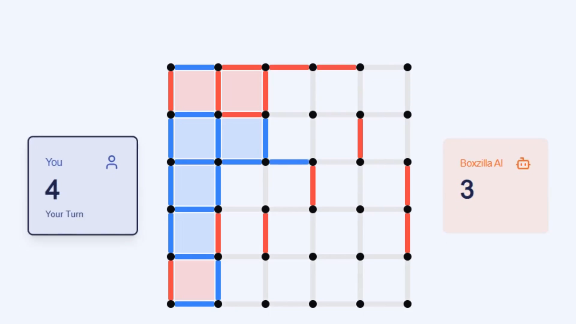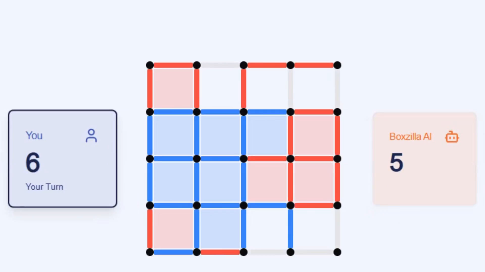 Boxzilla è controllato tramite semplici clic. Fai clic su un bordo vuoto tra i punti per disegnare una linea. Il gioco è intuitivo, consentendo ai giocatori di concentrarsi su strategia e pianificazione piuttosto che su controlli complessi. I potenziamenti si attivano automaticamente quando conquisti una casella, rendendo il gameplay fluido e coinvolgente.