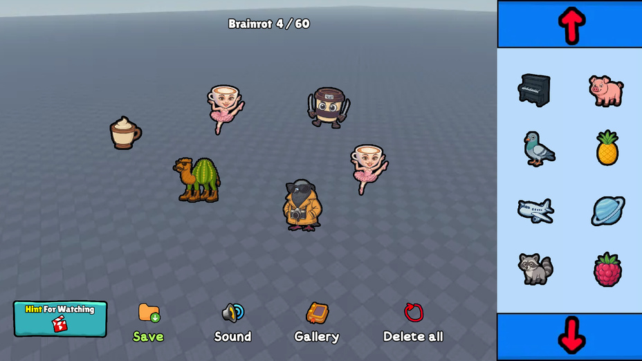 In Brainrot Craft, il semplice atto di unire risorse porta a un'esplosione di umorismo e creatività. La grafica minimalista è accompagnata dall'umorismo caotico dei meme generati, rendendo l'esperienza avvincente. L'obiettivo? Creare quanti più meme esilaranti possibile e godersi i risultati ridicoli!