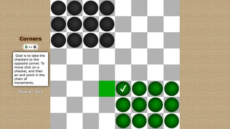 Pronto a sfidare il tuo pensiero strategico? Dive into Angolo, un gioco online coinvolgente in cui il tuo obiettivo è quello di spostare tutte le tue pedine nell'angolo opposto prima del tuo avversario. Con un gameplay intuitivo, questo gioco offre un delizioso mix di strategia e divertimento che può essere goduto sia al telefono che al computer. Scegli tra due entusiasmanti varianti: 9 (3x3) e 12 (4x3) dama. Sei pronto per la sfida?
