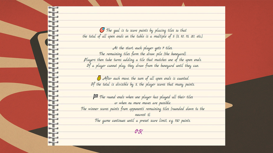 Immergiti nel classico mondo di Domino Fives Online, una coinvolgente esperienza di gioco da tavolo che combina strategia e interazione. Divertiti con questo gioco online dove puoi sfidare sia un’intelligenza artificiale sofisticata che utenti in tempo reale. L’obiettivo è raggiungere per primi un punteggio di 100, 200 o 300 punti, posizionando i dominó affinché la somma delle estremità aperte risulti divisibile per 5. Pronto a misurare le tue abilità?