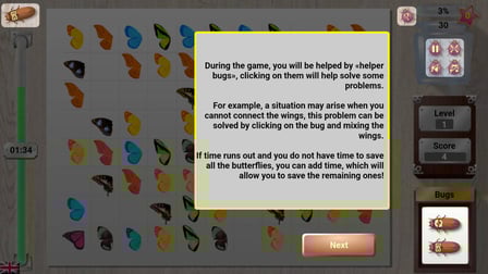 Per giocare a Free Butterflies Mahjong sul tuo computer, utilizza il mouse per fare clic sulle ali delle farfalle. Sul tuo dispositivo mobile, semplicemente tocca per selezionare le coppie. Ricorda di selezionare ali che possono essere collegate direttamente senza muri che ostacolano. Con solo 2 minuti per livello, l'efficienza è fondamentale!