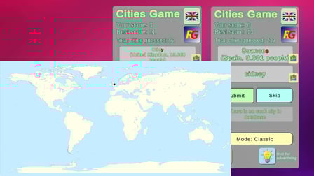 Entra nel mondo vibrante di Classic Cities, un avvincente gioco online che sfida le tue abilità di erudizione e vocabolario. Partecipa a una corsa emozionante contro il tempo, nominando città che iniziano con l'ultima lettera della città precedente. Questo concetto unico aggiunge un tocco di eccitazione, spingendoti a pensare in fretta mentre competi contro giocatori provenienti da tutto il mondo. Con ogni nome di città corretto, il gameplay diventa sempre più avvincente mentre accumuli punti e ti sforzi di conquistare la classifica.