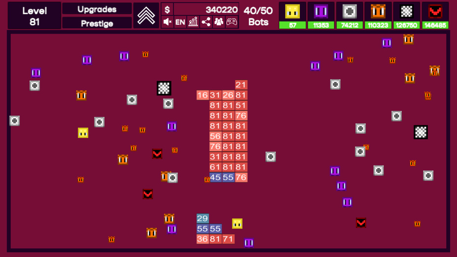 Iniziare con Idle Destroyer è semplice! Inizia selezionando il tuo primo distruttore e inizia a prendere di mira i blocchi. Mentre accumuli punti, investili in potenziamenti per migliorare le capacità dei tuoi distruttori. Attiva abilità speciali quando disponibili per infliggere danni enormi. Continuare a distruggere i blocchi, guadagnare successi, e scalare i ranghi in questo gioco di inattività coinvolgente.