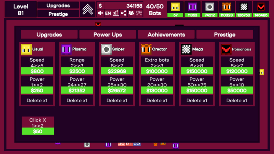 Entra nell'emozionante mondo di Idle Destroyer, un classico gioco inattivo in cui comandi più cacciatorpediniere con velocità e punti di forza variabili. Usa abilità speciali per annientare milioni di blocchi! Questo gioco dispone di 6 tipi unici di cacciatorpediniere, decine di aggiornamenti, un robusto sistema di bonus, e un sistema di successi amati. Immergiti nel gameplay accattivante che può essere goduto sia al telefono che al computer, offrendo infinite ore di intrattenimento online gratuito.