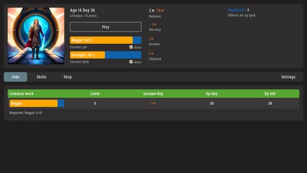 Immortal Knight è un gioco di simulazione di vita esilarante in cui puoi intraprendere un viaggio epico per salire la scala sociale e la carriera in un mondo fantasy medievale. Senza bisogno di registrazione o download, puoi immergerti in questa avventura basata su browser gratuitamente e sperimentare infinite possibilità sul tuo desktop, dispositivo Android o iOS. Quando inizi da umili origini come mendicante, le tue scelte determineranno il tuo percorso verso la grandezza. Sceglierai la vita semplice di un cittadino comune, perseguirai una carriera militare o ti immergerai nelle arti arcane in un'accademia di magia? La decisione è tua mentre navighi in questo gioco indie di alta qualità, perfetto come un timekiller per chi ama le simulazioni di vita fantasy.