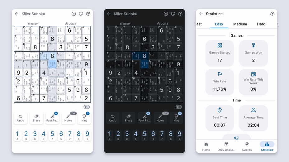 Killer Sudoku è un puzzle game coinvolgente in cui è possibile sfidare la vostra mente con il posizionamento logico dei numeri. Gioca a questo gioco di allenamento del cervello online gratuitamente senza scaricare e tuffati nel mondo stimolante della logica e della strategia. Con più di 12.000 puzzle classici killer sudoku ben formati, non sarai mai a corto di sfide. Progettato per tutti i livelli, dai principianti agli esperti di Sudoku, Killer Sudoku offre cinque livelli di difficoltà: veloce, facile, Medio, Difficile ed Esperto Sudoku. Goditi le sfide quotidiane e guadagna premi, il tutto giocando in qualsiasi ambiente, con o senza WiFi. Personalizza il tuo gioco con temi di colore per soddisfare il vostro umore e giocare comodamente anche al buio.
