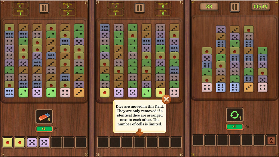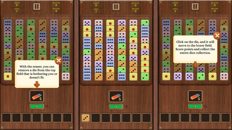In Logic Dice, prenderai il controllo di un'accattivante collezione di cubi per raggiungere l'obiettivo principale di risolvere enigmi e progredire attraverso 100 livelli di avventura. Mentre navighi attraverso luoghi unici, incontrerai varie sfide e un innovativo sistema di gioco che ti consente di unire cubi in set di tre identici per cancellare il tabellone di gioco. Il gioco è progettato per i giocatori di tutte le età che amano i puzzle casuali e il pensiero strategico. Senza registrazione richiesta e grafica di alta qualità, Logic Dice è perfetto per coloro che amano i giochi di allenamento del cervello a tema geometrico. Man mano che avanzi, svilupperai strategie uniche per superare gli ostacoli e migliorare la tua collezione di cubi. Preparati a immergerti nel mondo dei dadi logici e prova la tua abilità logica!