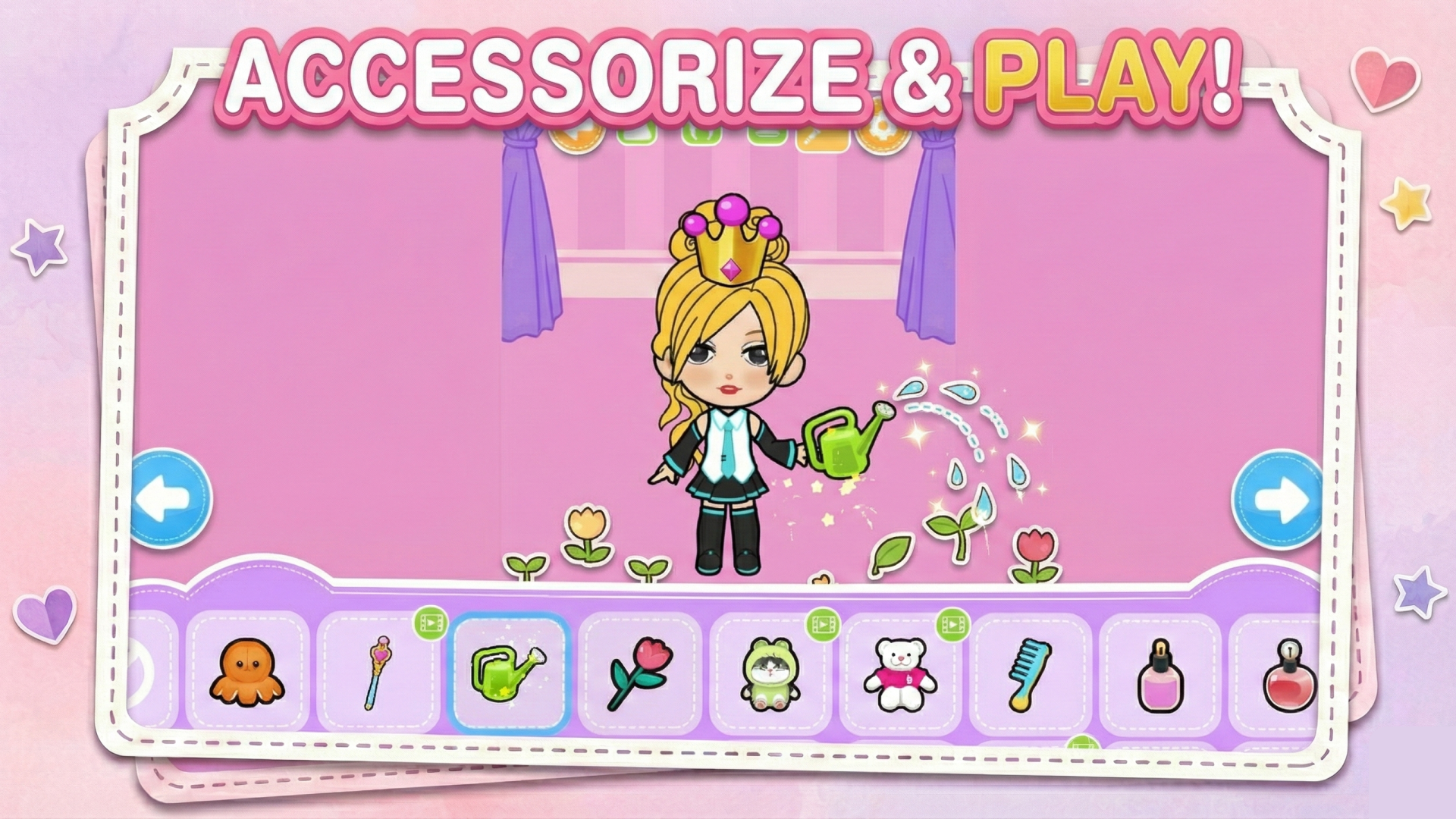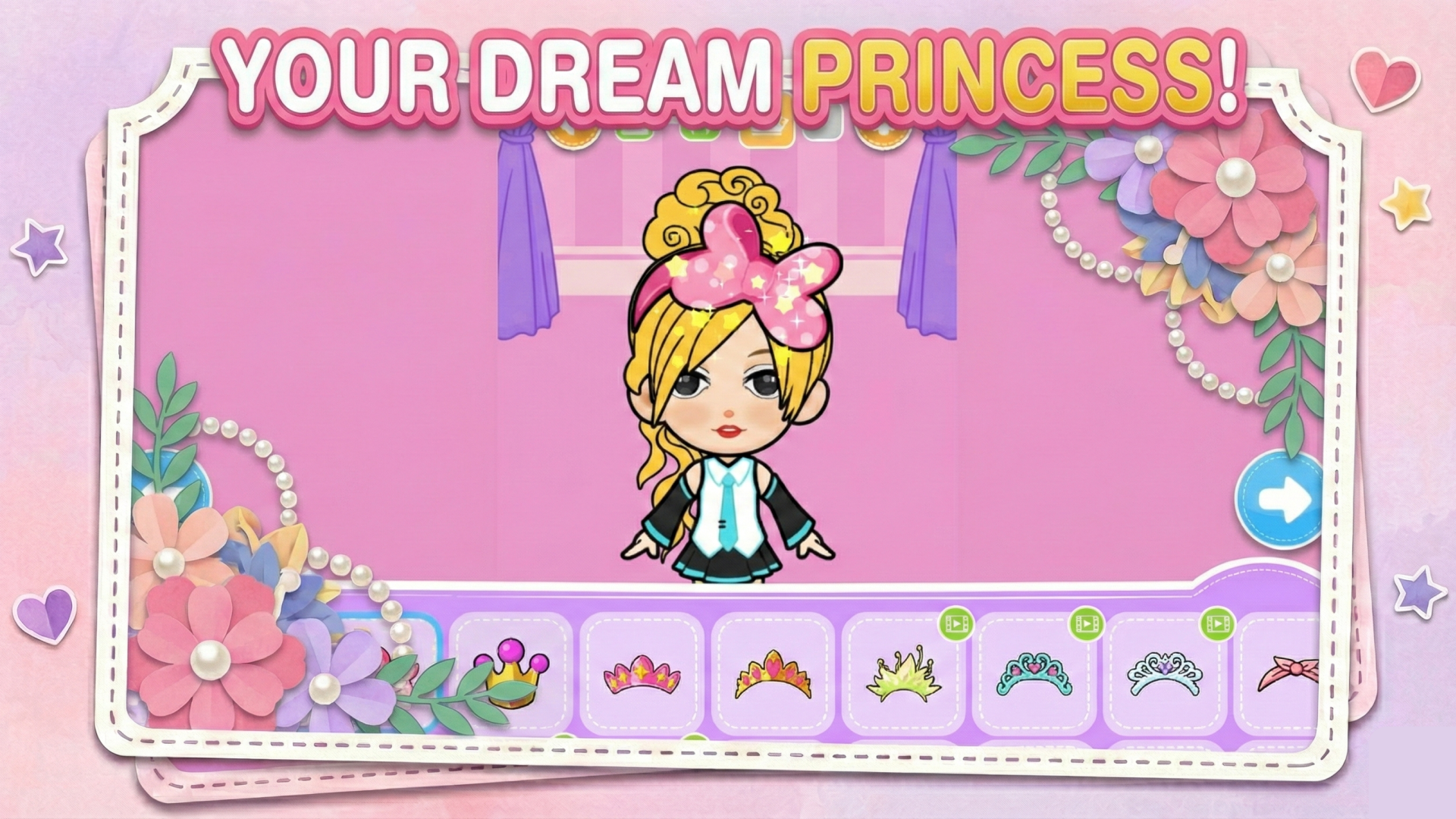 Inizi con un personaggio nella sua forma base—pensala come una tela bianca in attesa della tua visione. Sfoglia categorie come acconciature, abiti, scarpe e corone. Tocca un oggetto per vederlo istantaneamente sulla tua principessa. L'interfaccia è progettata per una rapida sperimentazione, permettendoti di passare in rassegna decine di look in pochi minuti senza schermate di caricamento.
