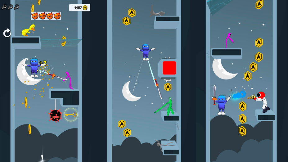 Usa i tasti freccia sulla tua tastiera per muovere il tuo personaggio (su, giù, a sinistra, a destra). Tocca il pulsante di lancio per scagliare la tua spada contro gli ostacoli e teletrasportarti. Non dimenticare di sfruttare le abilità speciali delle tue spade man mano che progredisci!