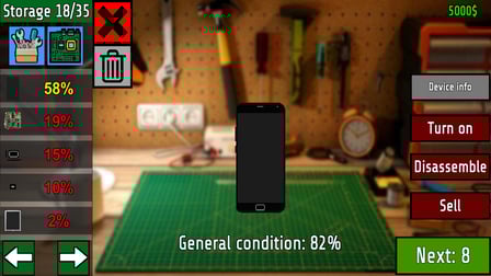 Per iniziare, seleziona un dispositivo rotto dall'interfaccia dell'officina. Usa il mouse o il touch screen per toccare i componenti e valutarne le condizioni. Seguire le istruzioni per diagnosticare i problemi, acquistare parti se necessario e sostituire i componenti danneggiati. Assicurati che ogni dispositivo soddisfi i suoi requisiti funzionali prima di venderlo!