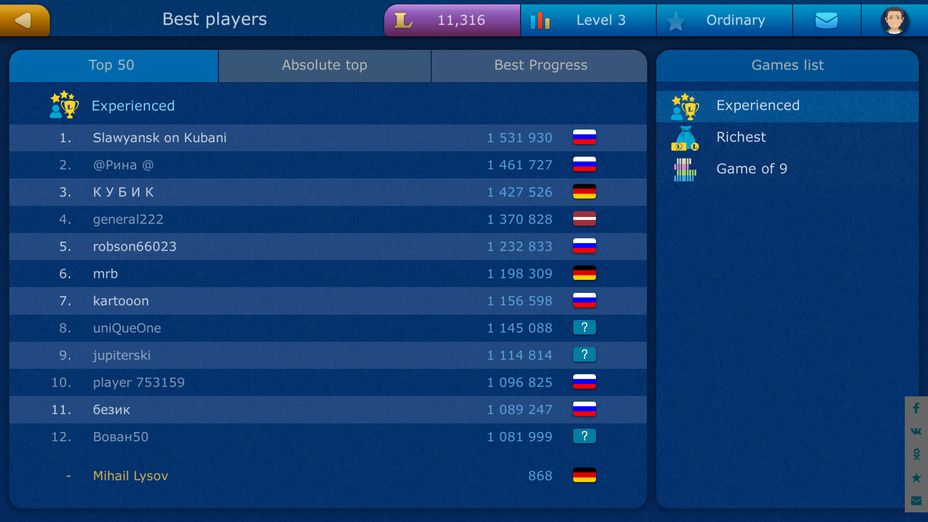 In Seven (Game of 9), prenderai il controllo di un mazzo di carte con l'obiettivo principale di superare in astuzia i tuoi avversari e vincere la partita. Il gioco di carte presenta varie impostazioni uniche, partite in tempo reale con giocatori reali e un sistema avanzato di premi e risultati. Senza distrazioni in-game come gli annunci, è possibile concentrarsi sull'elemento strategico e godere di un'esperienza di gioco ininterrotta. Progettato per gli adulti, questo gioco offre una piattaforma sofisticata in cui i giocatori possono impegnarsi in battaglie strategiche di carte e socializzare attraverso opzioni di chat integrate.