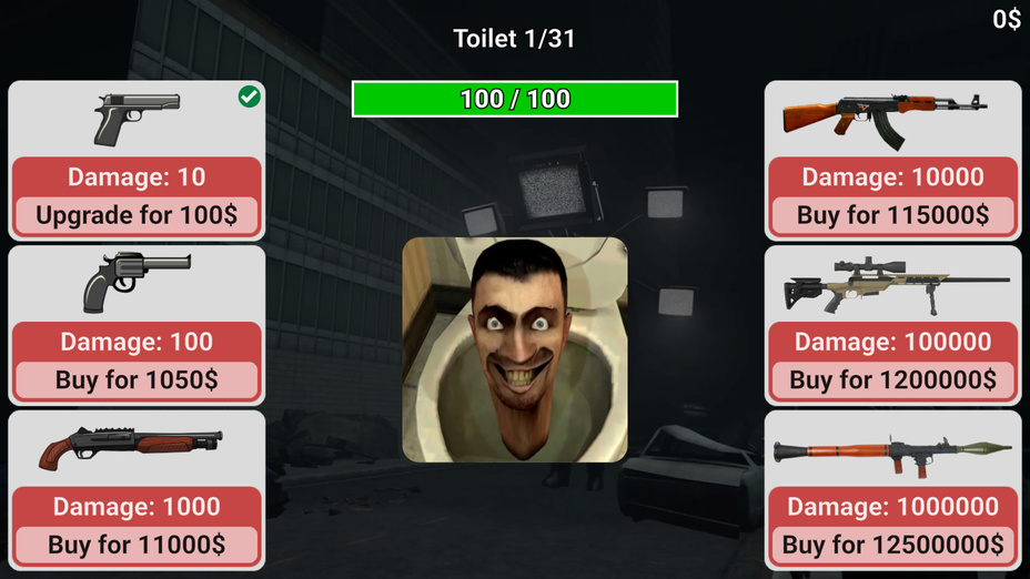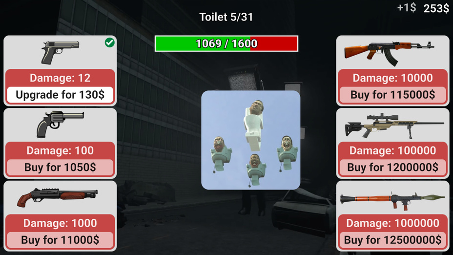 Per eccellere in Shoot Skibidi Toilets: Clicker, concentrati sull'aggiornamento delle tue armi, come pistole e fucili da cecchino, per sconfiggere i nemici più duri. Tieni d'occhio le battaglie con i boss che richiedono riprese strategiche e riflessi rapidi. Gestire saggiamente le tue risorse ti aiuterà a sbloccare i personaggi e a stare al passo con l'infezione che si diffonde in città.