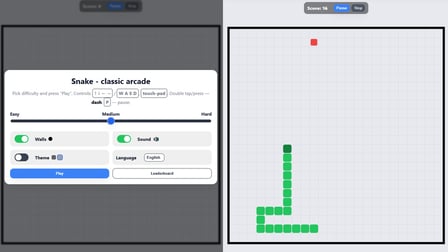 Immergiti in Snake - classic arcade, un entusiasmante remake dell'amato gioco arcade, ora accessibile sia su computer che su mobile. Questo gioco online gratuito ti permette di controllare un serpente mentre si avventura in un mondo pieno di cibo e sfide, con un'interfaccia moderna e controlli intuitivi. Scegli il tuo stile di gioco, affrontando differenti livelli di difficoltà con muri solidi o bordi avvolgenti per mettere alla prova le tue abilità.