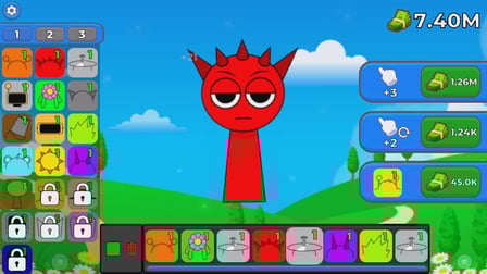 Iniziare con Sprunki Clicker è semplice: su un computer, fare clic sui personaggi colorati sullo schermo per guadagnare soldi. Su un Telefono, tocca i personaggi per ottenere lo stesso effetto! Usa i tuoi guadagni per acquistare aggiornamenti ed espandere la tua collezione di personaggi.