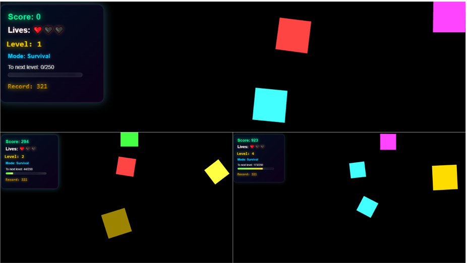 Per giocare a Squares sul tuo computer, basta usare il mouse per cliccare sui quadrati mentre cadono. Il tuo obiettivo è catturare quanti più quadrati possibile senza permettere che ne scenda alcuno. Per gli utenti mobile, basta toccare i quadrati man mano che appaiono sullo schermo per raccoglierli. Ogni quadrato catturato conta verso il tuo punteggio!