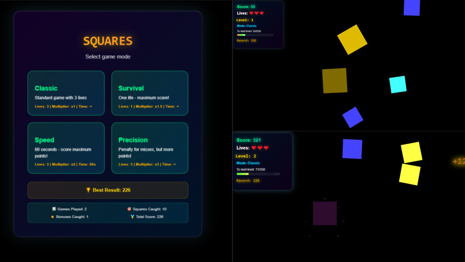 Per padroneggiare Squares sono necessari concentrazione e prontezza. Dai priorità ai quadrati bonus: non solo ti danno più punti ma possono cambiare notevolmente il ritmo del gioco. Tieni d'occhio i modelli di caduta e cerca di ridurre al minimo i fallimenti per allungare la tua vita!