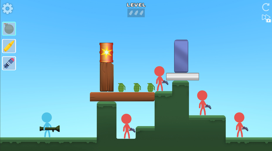 Iniziare con Stickman Bullets Ragdoll è semplice. Puntare il bazooka utilizzando i comandi del mouse o touch, quindi selezionare il tipo di proiettile che si desidera sparare. Regola il tuo obiettivo per colpire direttamente i nemici o creare esplosioni strategiche per distruggere le loro basi. Avanzare attraverso i livelli sconfiggendo tutti i nemici e superando le sfide presentate.