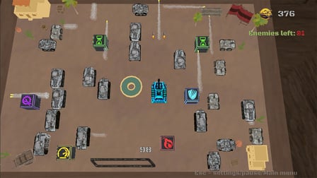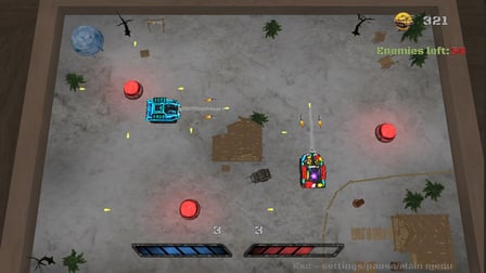 Per iniziare a giocare a Tank Sandbox, scegli il tuo carro armato e avvialo nel campo di battaglia. Usa i tasti WASD o le frecce per muoverti e mirare. Premi il tasto sinistro del mouse per sparare e raccogli bonus che appariranno sul campo per migliorare le tue capacità. Sconfiggi i tuoi avversari e guadagna punti esperienza per salire di livello. Una volta raggiunto il livello 5️⃣, visita il negozio per potenziare il tuo carro armato con nuove skin e armi!