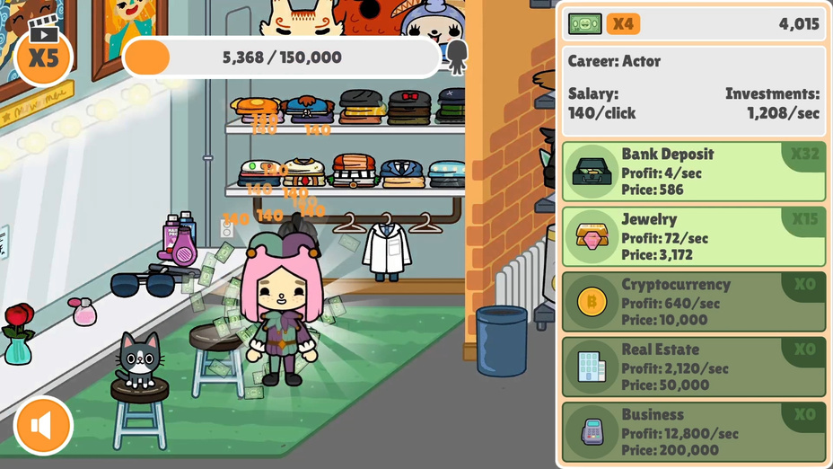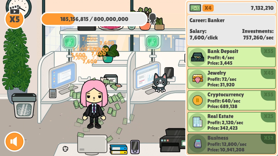 Per eccellere in Toca City Carriera e affari, si concentri su fare investimenti intelligenti. Diversifica il tuo portafoglio scegliendo tra banche, gioielli, criptovaluta, immobili o iniziando la tua attività. Ogni investimento porta reddito passivo, che ti aiuterà ad avanzare più velocemente. Tieni d'occhio le tendenze del mercato e gestisci il tuo tempo in modo efficiente per massimizzare i profitti. E non dimenticare di prenderti cura del tuo simpatico compagno, Mr. Lapkin, che sarà con te ad ogni passo!