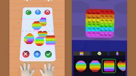 R: Il gioco presenta una varietà di giocattoli antistress tra cui pop-it, simple-dimples, spinner, slime e altro ancora.