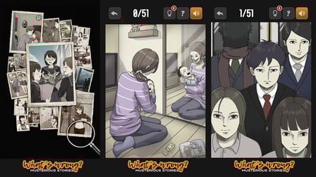 In Cosa c'è che non va? Storie mistiche, ogni scena è meticolosamente realizzata, armonizzando arte ed enigma per creare un'atmosfera avvolta nel mistero. I giocatori hanno il compito di scoprire le distorsioni nelle immagini familiari, portandoli più in profondità nel mondo enigmatico nascosto appena sotto la superficie. Sfida il tuo intelletto e allo stesso tempo affascina la tua immaginazione, rendendolo un gioco coinvolgente e stimolante.