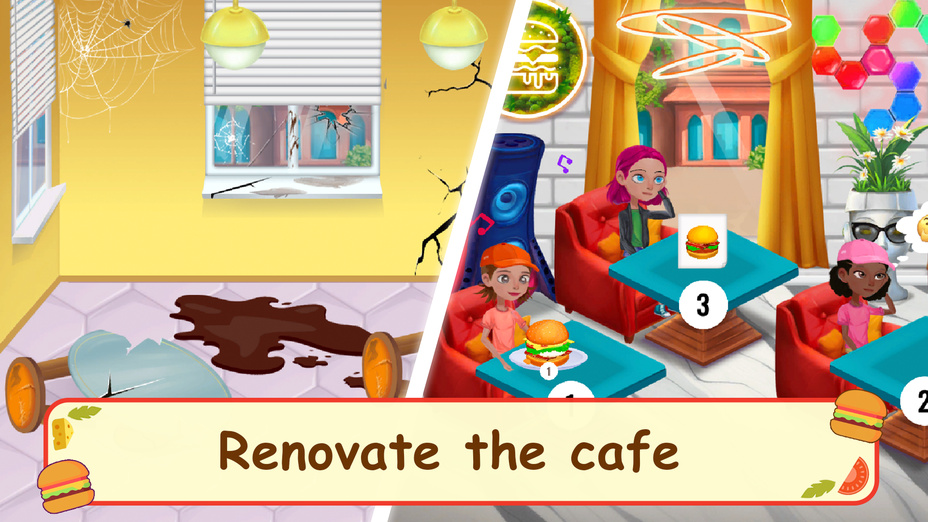 - Odblokuj nowe przepisy i ulepszenia kuchni, aby ulepszyć ofertę kawiarni.