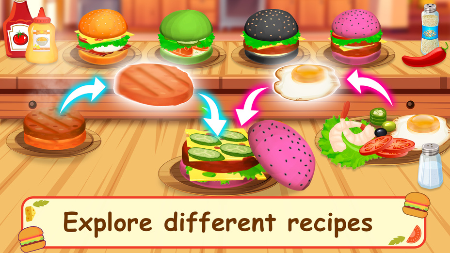 - Szeroka gama przepisów na burgery do odblokowania i opanowania.