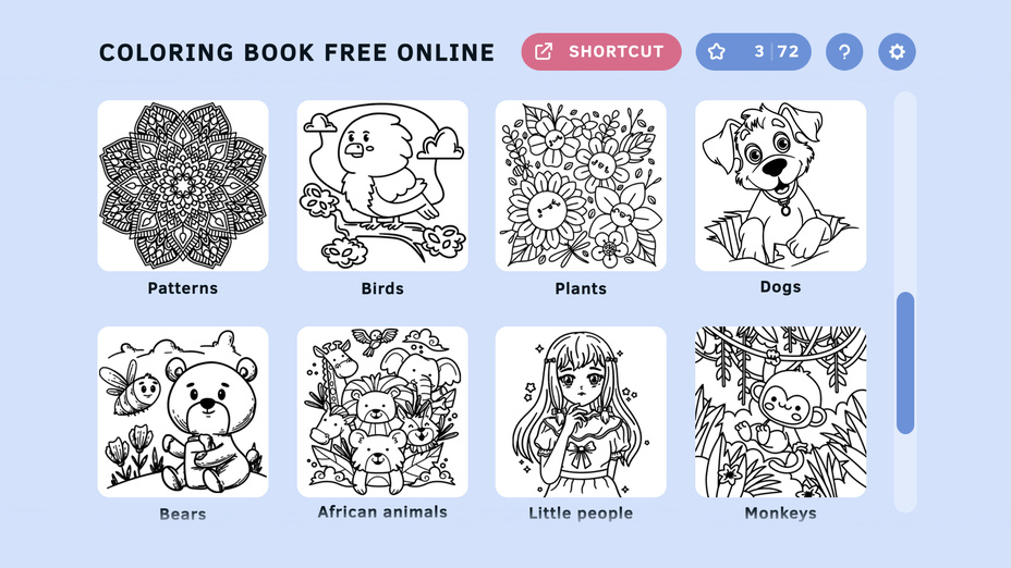 Coloring Book Free Online został zaprojektowany tak, aby był przyjazny dla użytkownika, dzięki czemu gracze w każdym wieku mogą łatwo nawigować i cieszyć się grą. Zacznij od wybrania kolekcji, która Cię intryguje, a następnie wybierz zdjęcie do pokolorowania. Wykorzystaj różnorodne dostępne narzędzia, aby dodać swój osobisty charakter do każdego obrazu.
