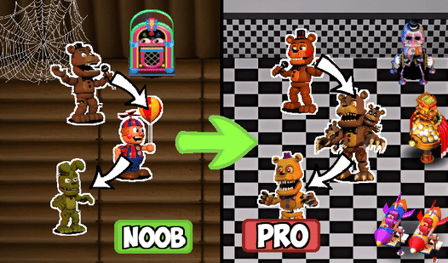 Rozpoczęcie gry w pizzerię Fnaf jest łatwe! Na telefon, palcem dotknij dwóch identycznych animatroniki. Za komputer użytkownicy, kliknij myszą. Obserwuj, jak się łączą, tworząc ulepszoną animatronikę. Łącz się w nowe ewolucje, jednocześnie rozszerzając wystrój swojej pizzerii, aby przyciągnąć więcej klientów i generować zyski.