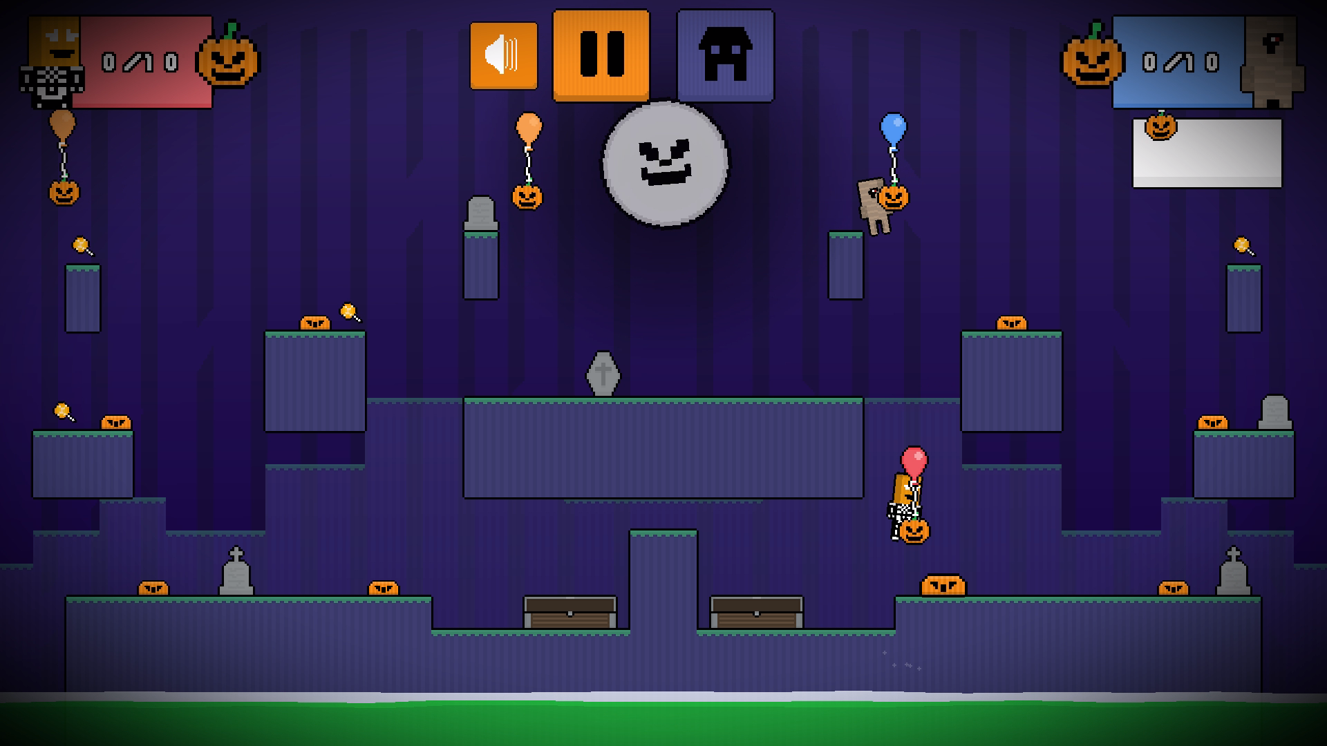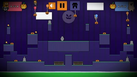 Graveyard Wars rozgrywa się na nawiedzonym cmentarzu pełnym dyń i przerażających przeszkód. Gra oferuje unikalne połączenie rywalizacji i personalizacji, gdzie gracze mogą wybierać z różnorodnych kapeluszy, aby nadać swoim postaciom indywidualny charakter. Głównym celem jest zbieranie 10 dyń szybciej niż przeciwnik, co czyni ją testem zarówno szybkości, jak i strategii. Mroczny klimat rozgrywki i szybka akcja sprawiają, że to wyróżniający się wybór dla fanów gier dla dwóch graczy.