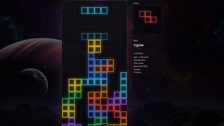 Przygotuj się na kolorową rewolucję z Neon Blocks, grą przeglądarkową, która perfekcyjnie łączy klasyczne elementy z nowoczesnym gameplayem. Sprawnie manipuluj spadającymi kształtami geometrycznymi, znanymi jako Tetromino, i stwórz solidne poziome linie, aby zdobywać punkty! Odmieni to, jak myślisz o zręcznościowych łamigłówkach online.