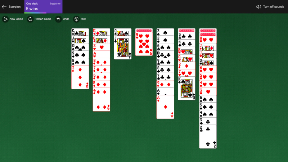 Scorpion Solitaire to ekscytujący i wymagający zwrot w klasycznej grze karcianej. Ta gra, nieco związana z pasjansem pająka, pozwala przenieść dowolną odkrytą kartę wraz ze wszystkimi kartami pod nią. Ta funkcja wprowadza strategiczną głębię, która sprawi, że będziesz uzależniony przez wiele godzin. Niezależnie od tego, czy grasz na telefonie, czy na komputerze, Ta darmowa gra online jest idealna do rozwijania lub wyostrzania umysłu.
