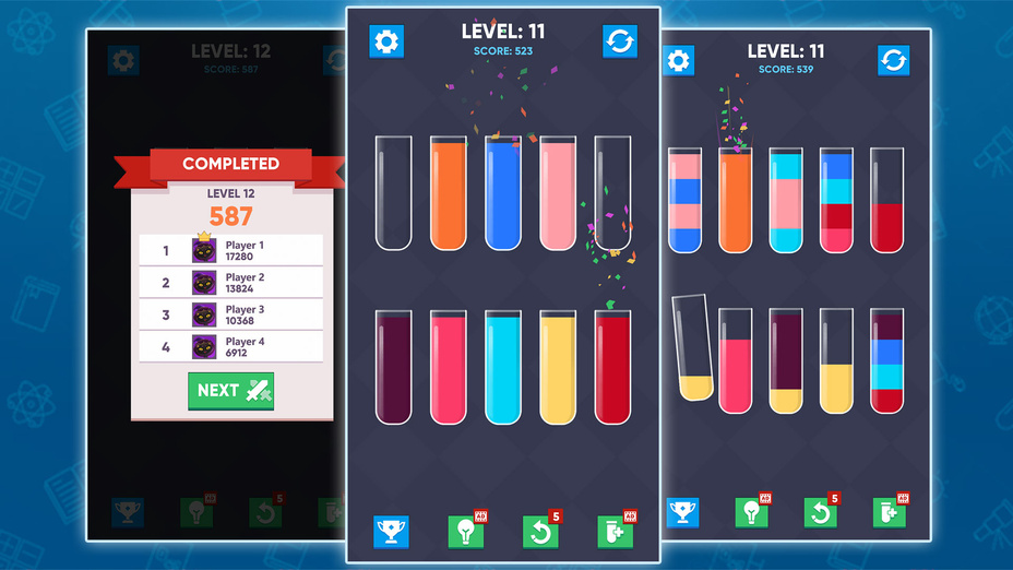 Sort It-Water Sort Puzzle to wciągająca łamigłówka logiczna, która rzuca wyzwanie graczom, aby posortować kolorową wodę do odpowiednich probówek. Należy do gatunku puzzli i oferuje unikalne połączenie zabawy i logicznej rozgrywki, której celem jest przetestowanie twojej inteligencji i umiejętności rozwiązywania problemów. Gra zadaje ci sortowanie płynów o różnych kolorach, używając minimalnych ruchów, aby osiągnąć swój cel i wypełnić odpowiednie pojemniki. Dzięki uzależniającej naturze każdy poziom staje się trudniejszy, angażując graczy do głębokiego przemyślenia swoich ruchów.