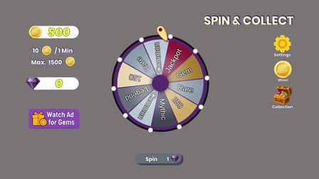 Rozpoczęcie gry w Spin and Collect jest proste. Po prostu kliknij lub dotknij przycisku "ZAKRĘĆ", aby uruchomić koło. Każde zakręcenie może przynieść nowy dodatek do Twojej kolekcji lub przyspieszenie postępu. Zbadaj inwentarz, aby zobaczyć swoją aktualną kolekcję i zaplanuj swój następny ruch. Wszystko kręci się wokół emocji związanych z zakręceniem i radością z kolekcjonowania.