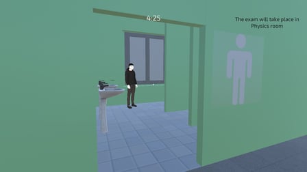 Użyj klawiszy strzałek do ruchu, spacji do interakcji z innymi uczniami i obiektami, i upewnij się, że śledzisz otoczenie, aby uzyskać najlepsze wyniki podczas egzaminu.