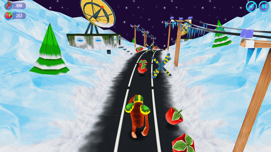 - Collect: Zbierz jagody rozrzucone wzdłuż ścieżki dla punktów i power-upy.