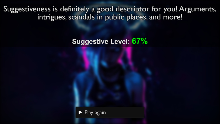 Kendinizin gizli yönlerini keşfedin; ilginç sorularla tasarlanmış olan Are You Suggestive? eğlenceli ve interaktif bir deneyim vaat ediyor. Bu çevrimiçi ve ücretsiz oyun, kahkaha ve kendini keşif dolu oyun deneyimi sunuyor.