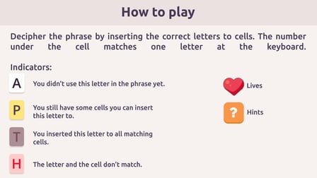 Etkileşimli uygulamalar alanında uzmanlar tarafından geliştirilen Cryptogram: Unveil ifadesi, HTML5 tasarımı sayesinde çeşitli platformlarda sorunsuz çalışır. Yüksek puan alan ilgi çekici bir oyun olarak, becerilerini test eden zorlukların tadını çıkaran kelime bulmaca meraklılarına hitap ediyor. Oyuncular, deneyimi taze ve bağımlılık yapan günlük bulmacaların tadını çıkarabilirler.