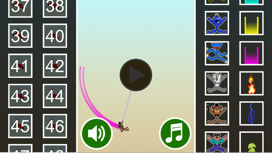 Oynat düğmesine tıklayarak ve karakter cildinizi seçerek başlayın. Nişan almak ve kancanızı hedeflere doğru çekmek için fareyi veya dokunmatik ekranı kullanın. Fare düğmesini veya ekranı basılı tutarak sallayın ve atlamak için bırakın. Bitiş çizgisine ulaşana kadar çeşitli engellerin üzerinden geçerek bu işleme devam edin.