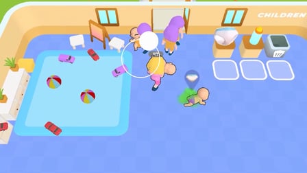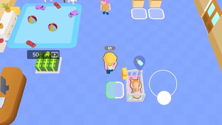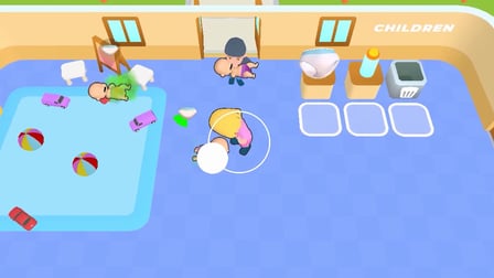 Alanınızda gezinmek için joystick'i kullanarak günlük bakım yolculuğunuza çıkın. Onları toplamak için bebek bezlerine yaklaşın, ardından bebek bezi değişimi yapmak için bebeğe gidin. Beslenme süresi için bir şişe alın ve aç bir bebeğe verin. Şekerleme zamanı geldiğinde, dinlendirici bir uyku için bebeği yavaşça beşiğe taşıyın. Tüm küçüklere iyi bakıldığından emin olmak için bu eylemleri tekrarlayın.