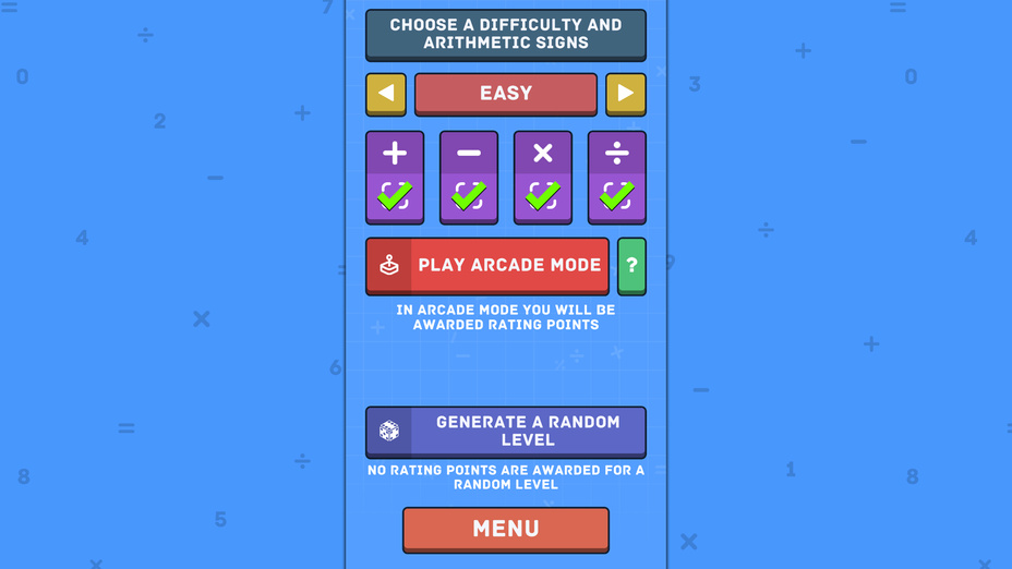 Matematiksel Bulmacada başarılı olmak için becerinize uygun bir zorluk seviyesi seçerek başlayın. Daha basit bir meydan okuma arıyorsanız aritmetik işaretleri kapatın ve cesaretinizi test etmek için açın. Arcade modunda, bulmacalar giderek zorlaşır, bu yüzden hareketlerinizi dikkatlice planlayın. Unutmayın, Arcade modundan her zaman çıkabilir ve ilerlemenizi oyun menüsünden kaydedebilirsiniz.