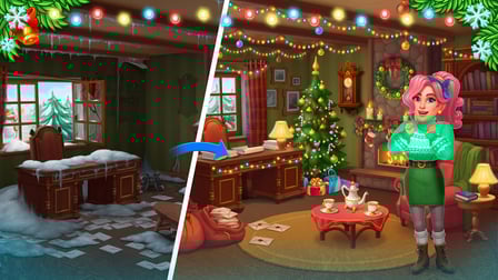 Noel'i Birleştir. Ev Tasarımı, nihai tatil evini yaratmakla ilgilidir. Oyun, bulmaca çözme, ev dekorasyonu ve hikaye anlatımı unsurlarını birleştiriyor. Oyuncular, güzel dekorasyonlar ve mobilyalar oluşturmak için çeşitli öğeleri birleştirir ve daha sonra şenlikli meskenlerinde farklı odalar tasarlamak için kullanırlar. Yol boyunca, Noel Baba'yı ve sürpriz bir konuğu içeren gizemli bir hikayeyle karşılaşacaklar ve oyuna bir entrika unsuru katacaklar. Renkli grafikler, büyüleyici müzik ve tatil ruhu bu oyunu oynamaktan keyif alıyor.